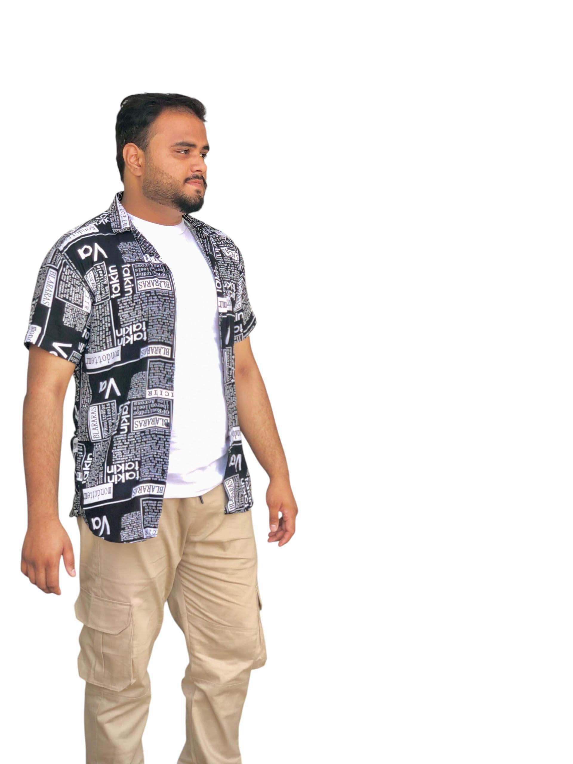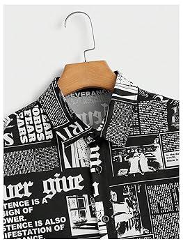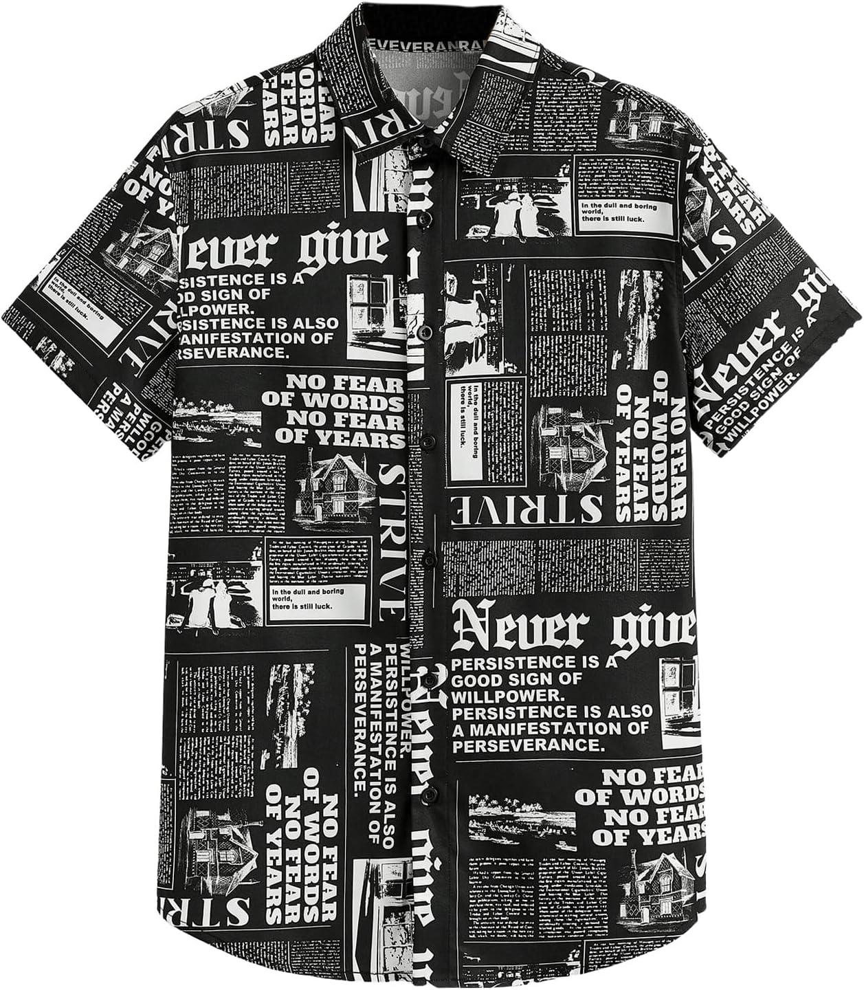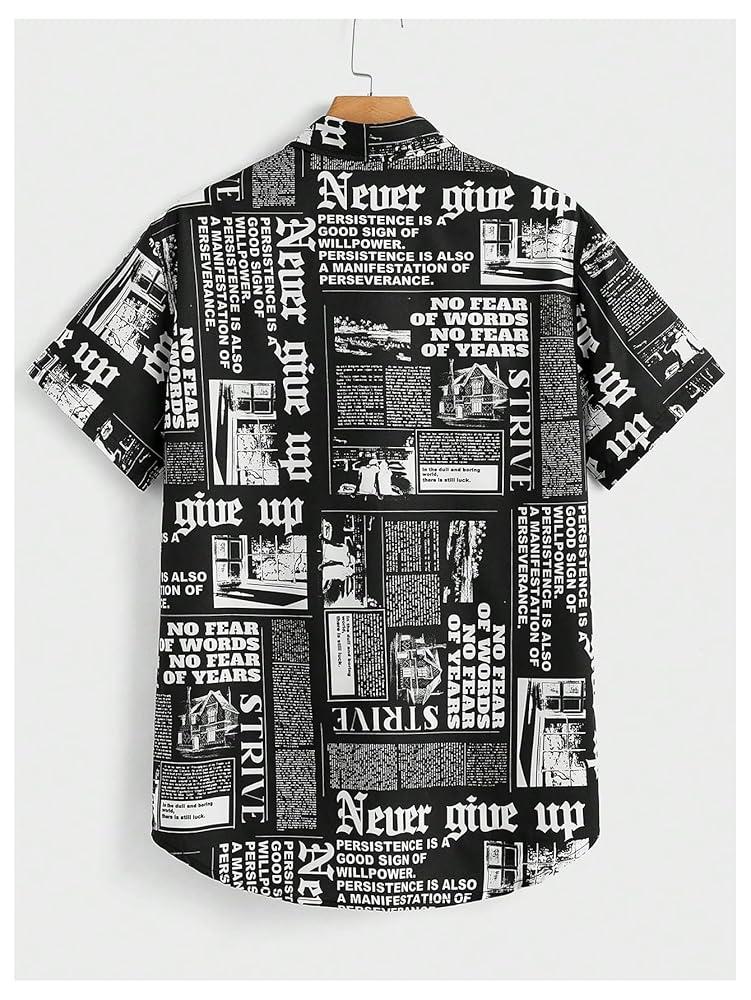 - Features: newspaper print, short sleeve, button front, streetwear, summer casual shirt